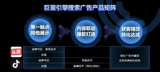 基于自身強大(dà)的(de)流量價值與發展潛力,巨量引擎爲廣告主打造了(le)包括品牌專區(qū)、超級品專、搜索彩蛋、明(míng)星品專、直播品專、搜索競價等多(duō)元化(huà)搜索營銷産品,通(tōng)過全場(chǎng)景品牌占位,促成流量到效果的(de)高(gāo)效轉化(huà)。