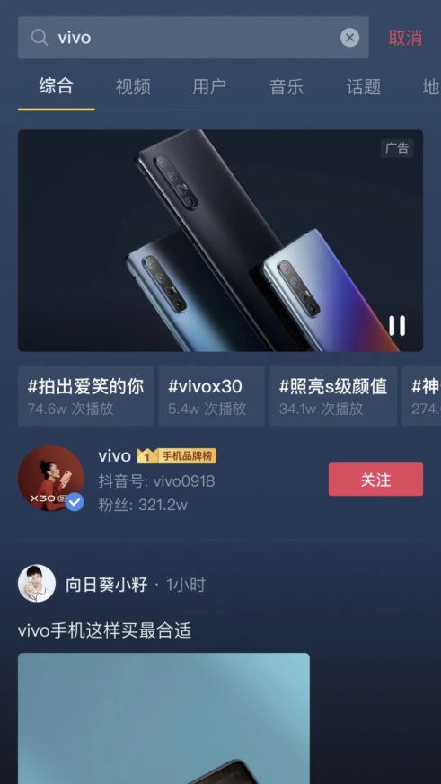 作爲強内容種草(cǎo)平台,抖音(yīn)則爲品牌提供了(le)明(míng)星品專、直播品專等多(duō)款強内容聯動的(de)搜索廣告産品。當用(yòng)戶在抖音(yīn)搜索明(míng)星或綜藝關鍵詞時(shí),就會觸發明(míng)星品專,獨家展示合作品牌橫版視頻(pín)并引導用(yòng)戶關注明(míng)星或綜藝IP抖音(yīn)号,有效沉澱興趣用(yòng)戶。