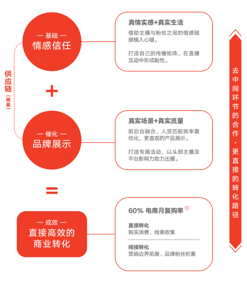 該模式借助主播與粉絲之間的(de)情感鏈接建立起信任關系,在直播互動中形成黏性,再以前後台融合、直觀産品展示、最優化(huà)人(rén)貨匹配效率打造專屬活動,以頭部主播及平台影(yǐng)響力助力品牌出圈,最終實現直接高(gāo)效的(de)商業直接、間接轉化(huà)。